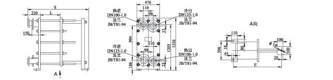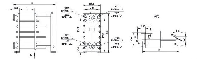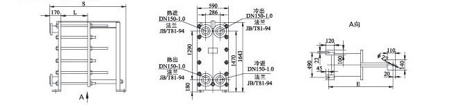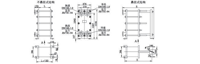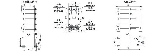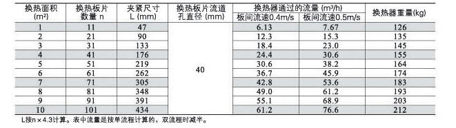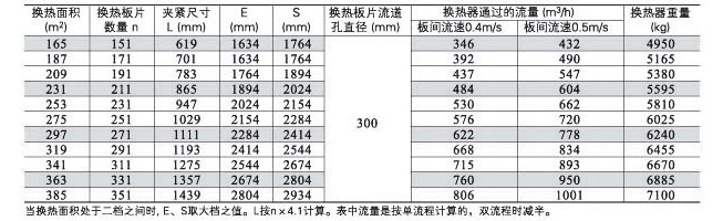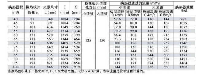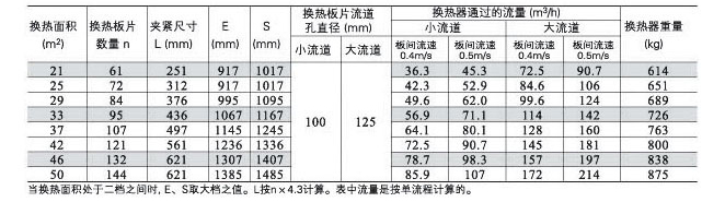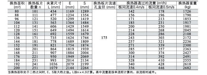 由于不同時期的產(chǎn)品參數(shù)可能有變化,因此下面參數(shù)表中的數(shù)據(jù)僅供參考。圖中接口法蘭大小為常規(guī)規(guī)格,如果流量較小時可以減少,但一般不能加大。表中都是以單流程組裝形式為例,也可裝成多流程形式。換熱面積也可以不按表中格擋數(shù)值而任意選取,當(dāng)換熱面積位于表中二檔之間時,懸掛式的E、S尺寸要按下一檔的大檔之值確定,L尺寸要按表下面的算式算出。