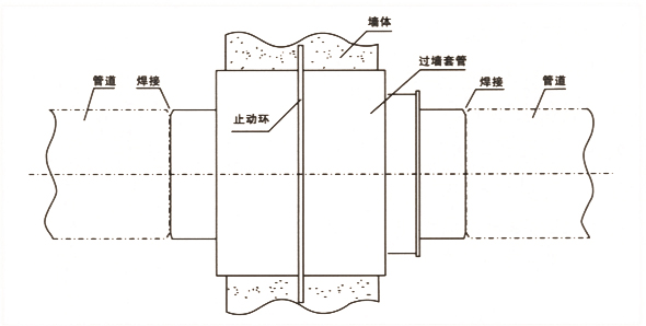 安裝時(shí)將過(guò)墻管的兩端與主管道焊接后,止動(dòng)環(huán)與墻體澆注于一體即可完成安裝,也可先澆注再焊接。